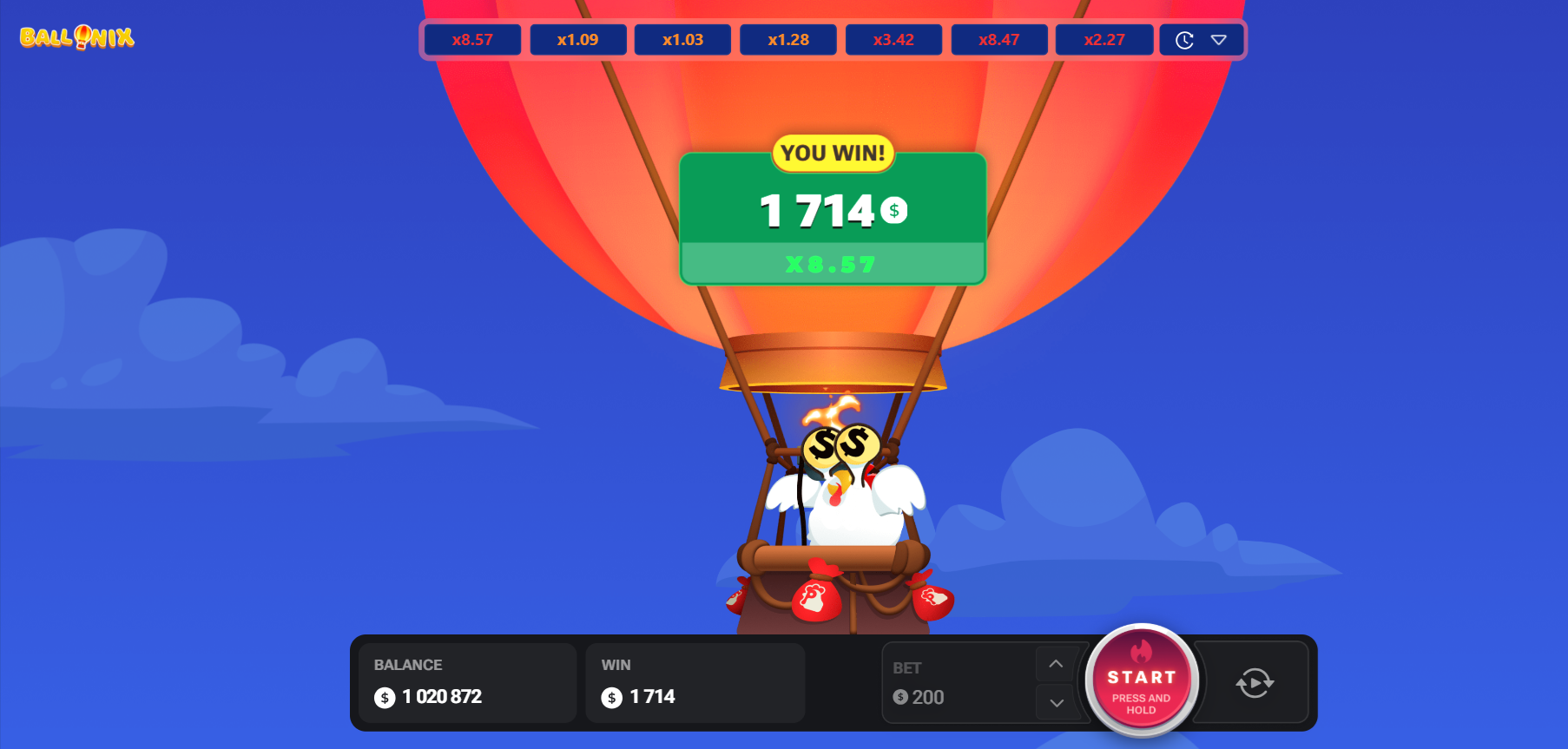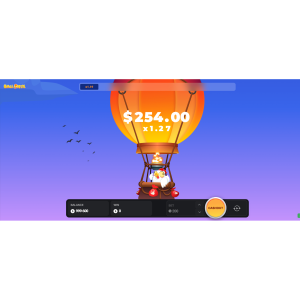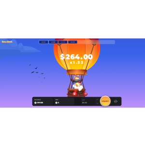 - The balloon starts to rise. Alongside it, a multiplier ticks upward: ×1.01, ×1.10, ×1.25, ×1.50, ×2, and so on.